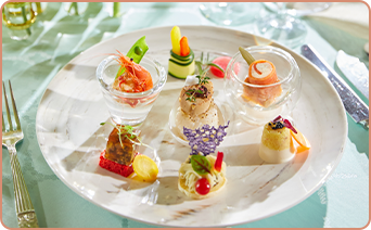 季節のデザートを使ったオリジナルビュッフェなど、明るく開放的な空間でゲストとの歓談も弾むひとときを過ごしていただけます。