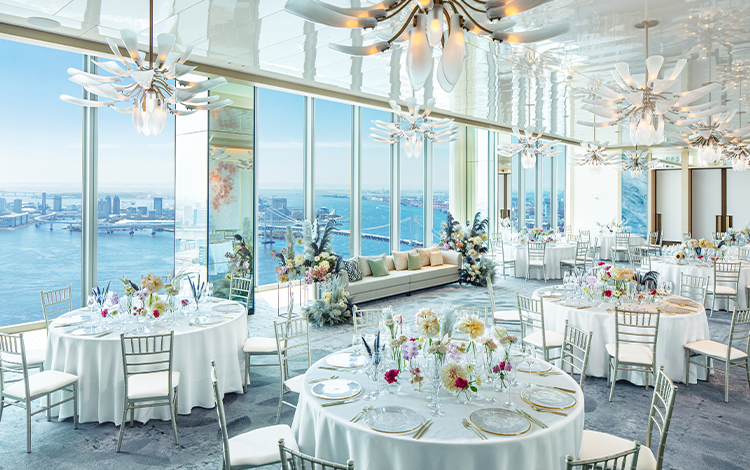 無限の空と海、レインボーブリッジや東京湾岸一帯を見渡せる 43 階のスカイバンケット。会場内に設えたオープンキッチンで、シェフのライブパフォーマンスを楽しめるのも、素敵な演出のひとつです。